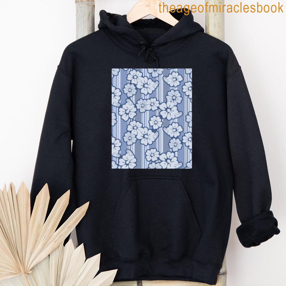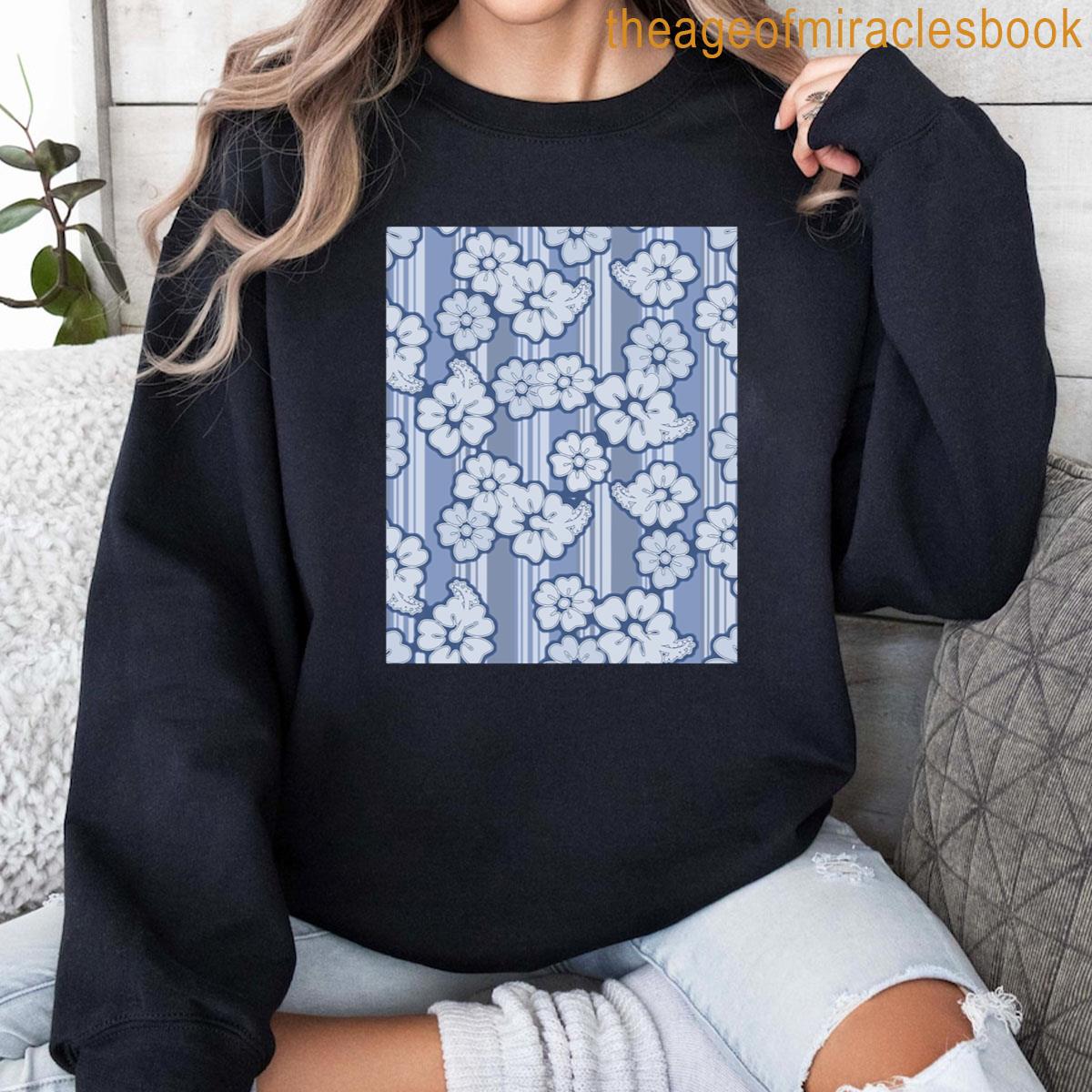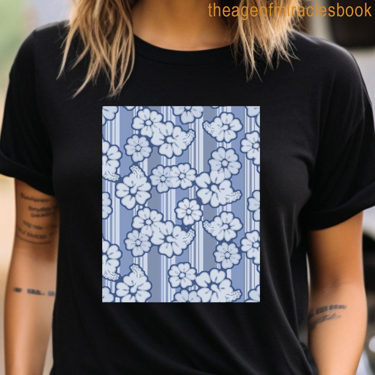 Blue Denim Hibiscus On Stripes Graphic T-shirt