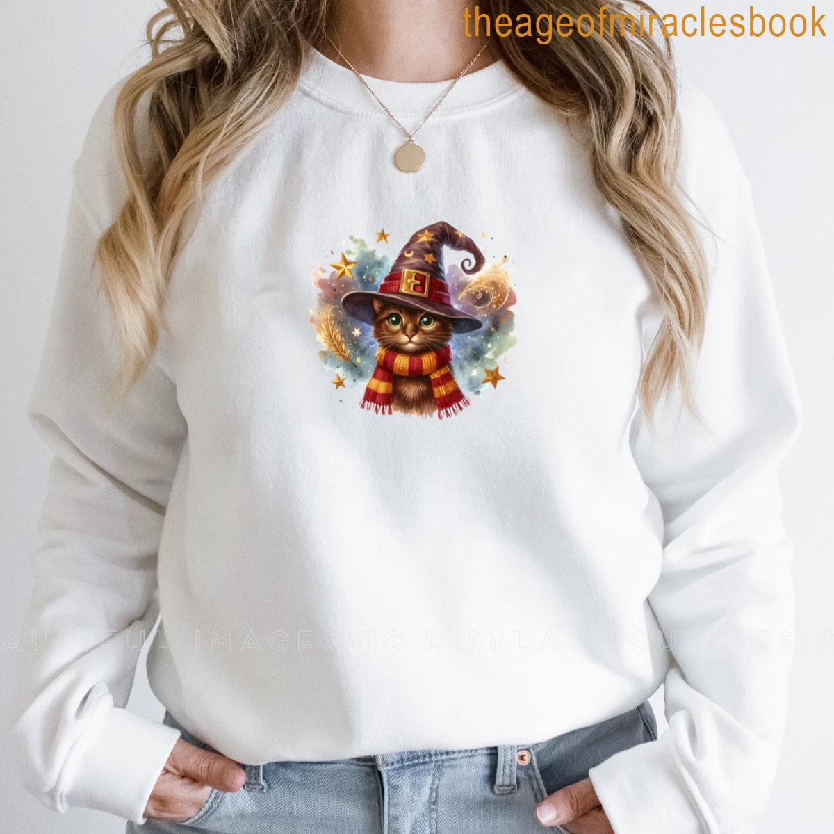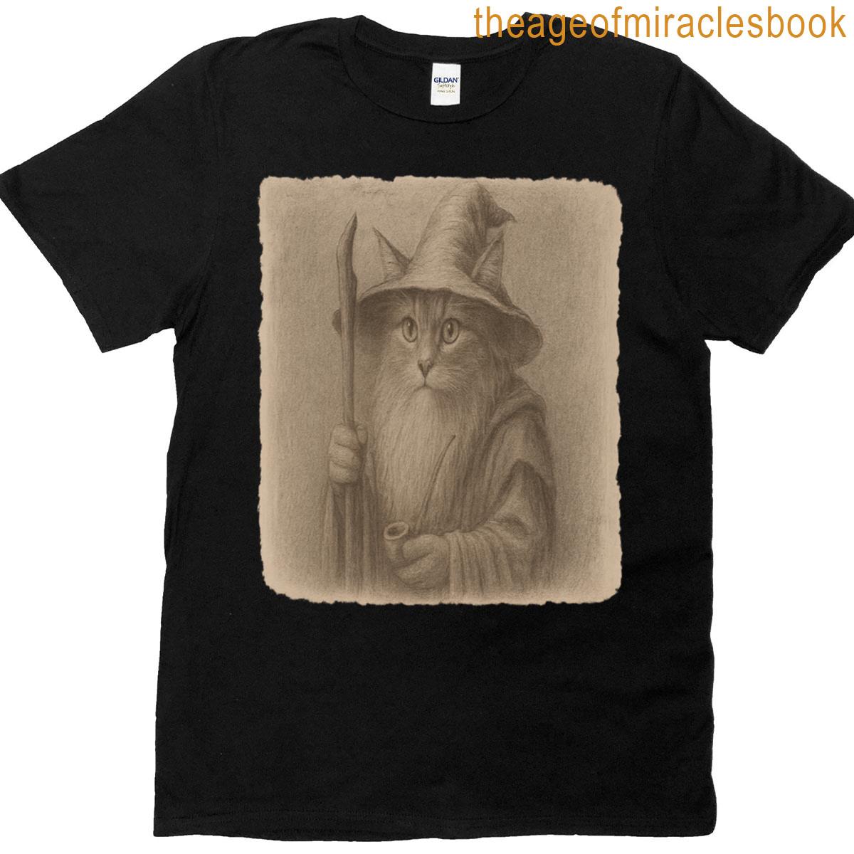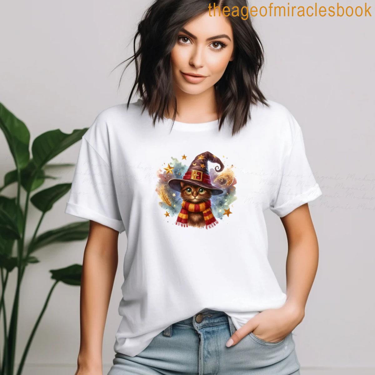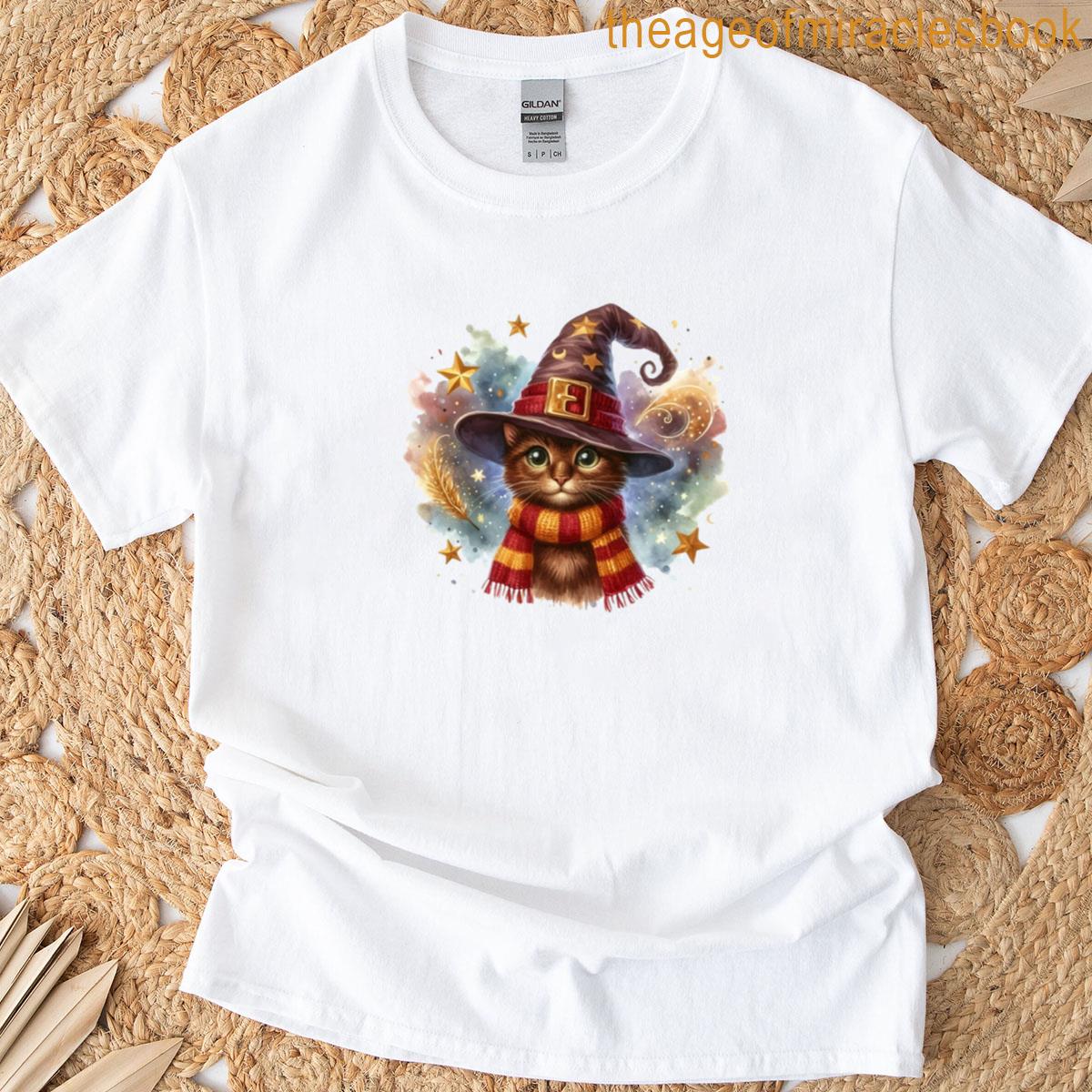 Brave Cat In Wizard Hat And Striped Scarf – Bold Feline Fantasy Art T-shirt